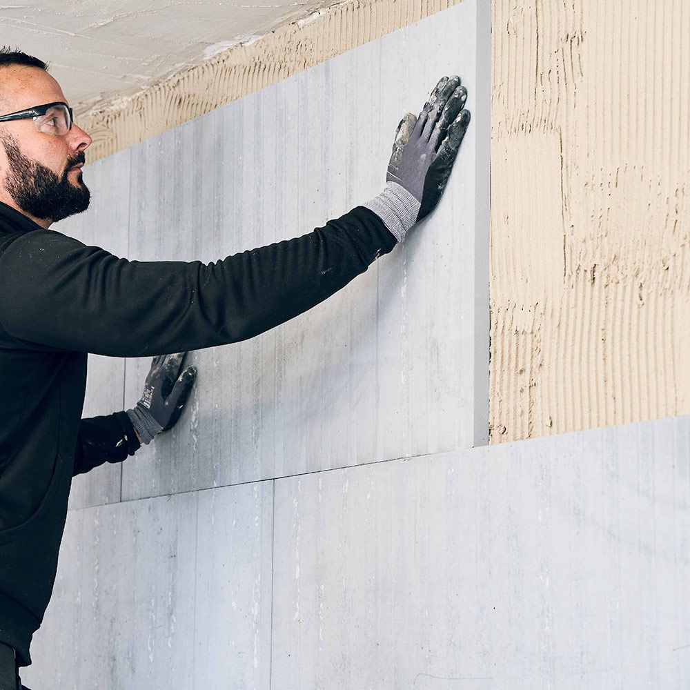Die Platte lässt sich mit handelsüblichen Werkzeugen passgenau zuschneiden und problemlos an Elektro- oder Sanitärinstallationen anpassen. Saubere Anschlüsse sowie Wand- und Deckenübergänge werden mit den Spezialplatten MANDRYLL TEC ID KEIL und MANDRYLL TEC ID LAIBUNG ausgeführt.